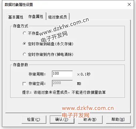 2、點擊存盤屬性可以自行選擇數據要不要保存在觸摸屏,存盤周期是多少,存儲空間是多少。