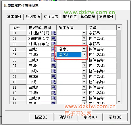 4、點擊輸出信息,曲線1和曲線2的輸出變量分別關聯上組對象成員:溫度1和溫度2;