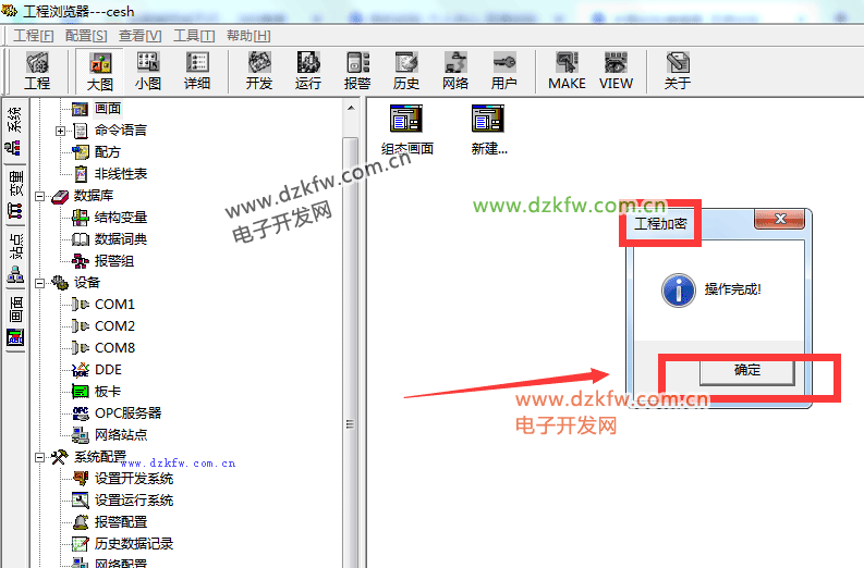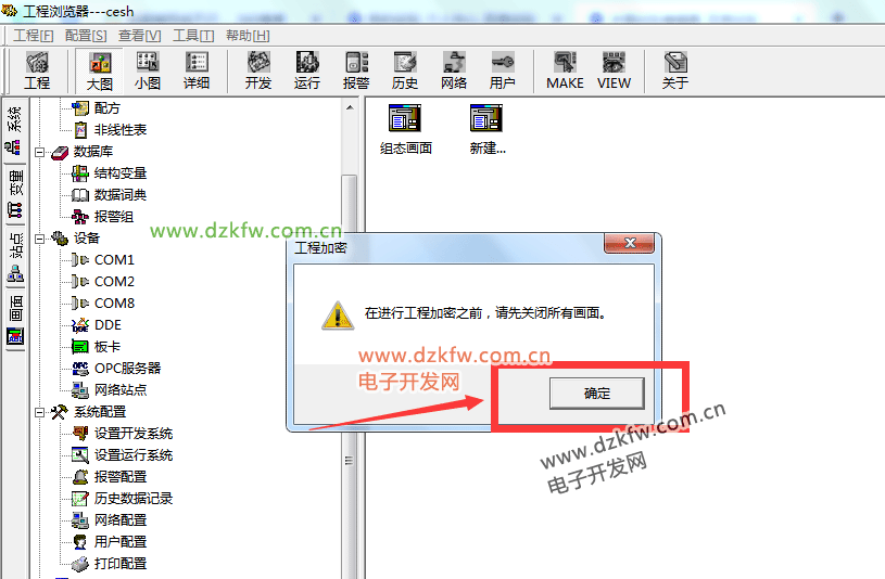 然后將開發(fā)系統(tǒng)中的所有界面關(guān)閉,并在彈出的工程加密對話框中選擇【確定】