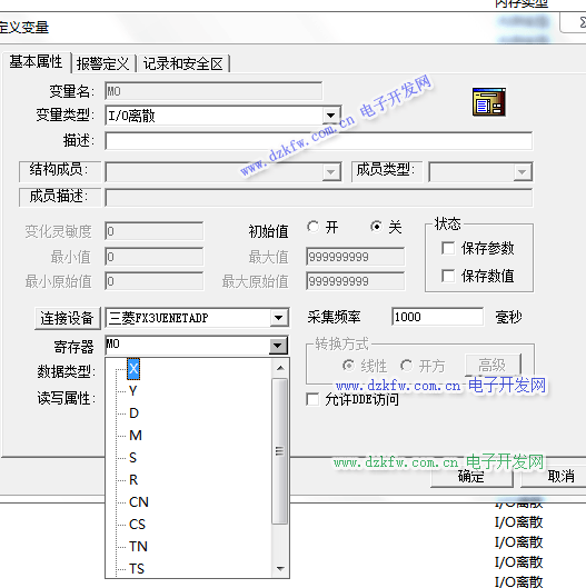 變量名隨便寫,變量類型為I/O離散型,連接的設備為上面第二步PLC指定的名稱,寄存器為M0 點擊確定。