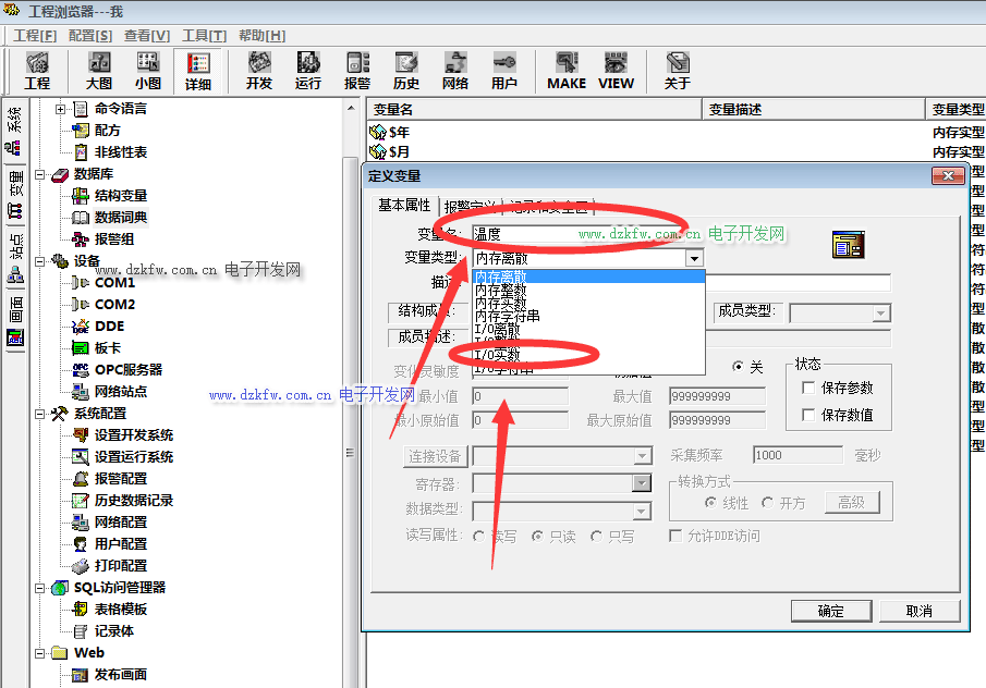 然后在彈出的定義變量窗口中,變量名輸入為【溫度】,變量類型選擇【I/0實數】