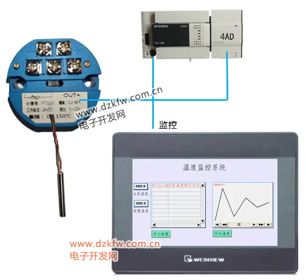 有一個溫度模塊,能測量現場溫度,能發送出0~10V的電壓信號,通過三菱的模擬量輸入模塊采集其信號,三菱PLC鏈接了一臺威綸通的觸摸屏,需要對其溫度信號進行處理和報警控制。