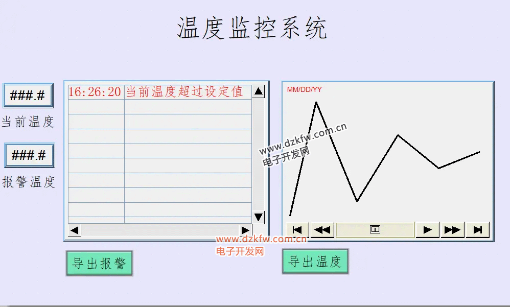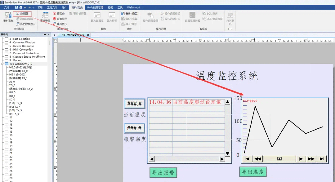 觸摸屏軟件使用EBpro軟件,設計界面如下,右邊的是溫度的實時曲線圖,左邊的是溫度報警表,當當前溫度超過了報警溫度這種時,就會在這個表格上顯示對應對應的報警。