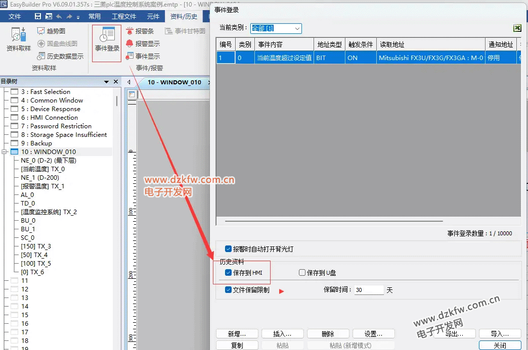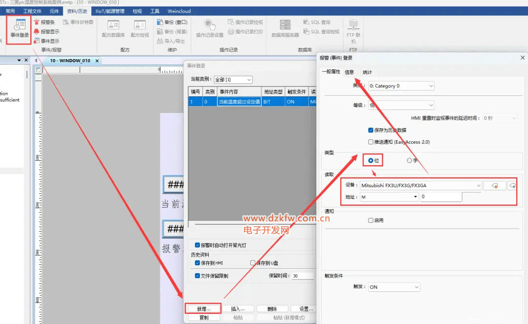 然后需要在事件登錄中添加M0作為報警信息,顯示信息設置為“當前溫度超過設定值”
