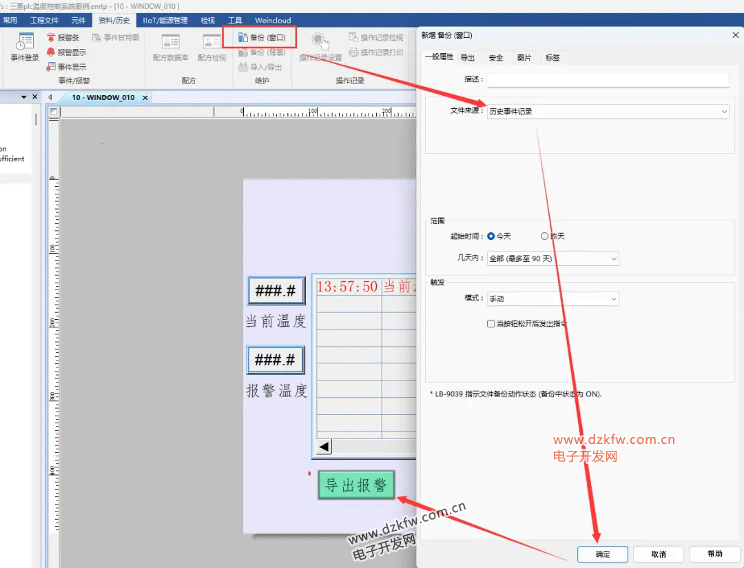 如果需要把報警記錄導出到U盤,則需在事件登錄的頁面把報警信息保存到觸摸屏,然后制作一個備份的按鈕,當U盤插入觸摸屏時,按下這個按鈕,報警數據就會被傳送到U盤。
