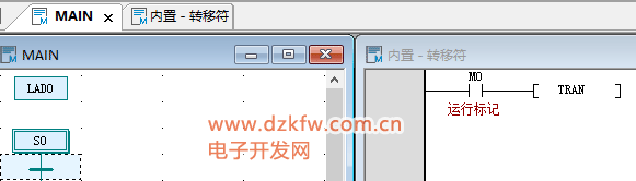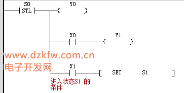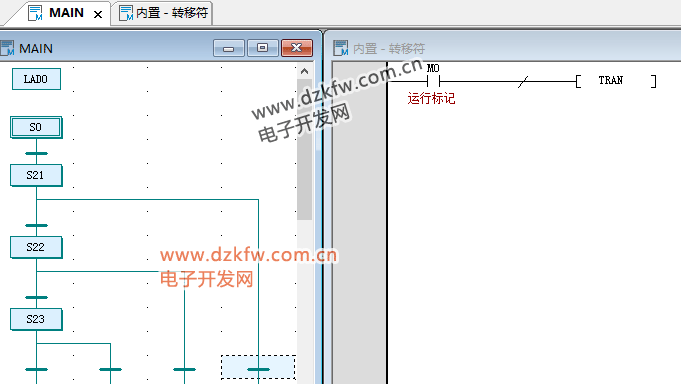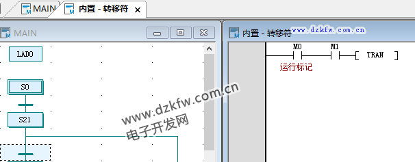 第一條狀態(tài)轉移SET S22指令的條件(M0和M1常開觸點)被替換成了左邊的“‘狀態(tài)轉移符’”