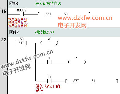 M8002軟元件是程序運行的第1個掃描周期標志,程序運行第1個掃描周期為ON,后面一直為OFF,也就是說程序運行第一個掃描周期時M8002導通,S0置1,后面的初始狀態(tài)S0常閉觸點也就導通,即進入初始狀態(tài)S0;