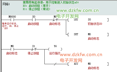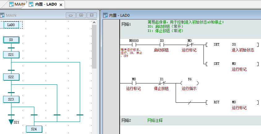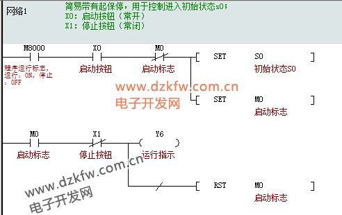 網(wǎng)絡1:開機后,按下“啟動按鈕”X0的時候,S0置位(進入初始狀態(tài)),M0置位(由于是SET指令,所以會保持),“運行指示”燈Y6亮;運行時,按下“停止按鈕”,M0復位,“運行指示”燈Y6滅;