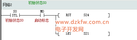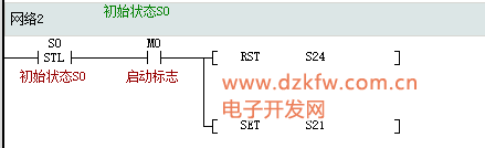 “啟動按鈕”按下時就會進入初始狀態(tài),初始狀態(tài)下用于復位狀態(tài)S24,并進入下一個狀態(tài)S21;復位S24是因為運行過程中,當按下“停止按鈕”時,會進入停止狀態(tài)S24,S24被置位,因此,當再次按下“啟動按鈕”運行系統(tǒng)時,需要復位S24;