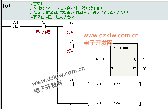 運行時,進入狀態(tài)S21后,S21常開觸點和M1常開觸點都置位導通,燈A亮,燈A亮導致計時器開始計時,3秒后,計時器輸出端口Q置位,即M1置位,M1常開觸點閉合,進入狀態(tài)S22,S21常開觸點斷開,S21狀態(tài)的功能失效(燈A滅,計時器復位);
