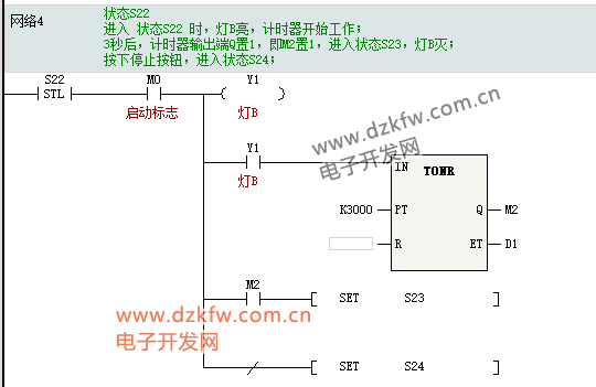 當按下“停止按鈕”時,M0常開觸點斷開,燈A滅,計時器復位并進入狀態(tài)S24(停止狀態(tài));