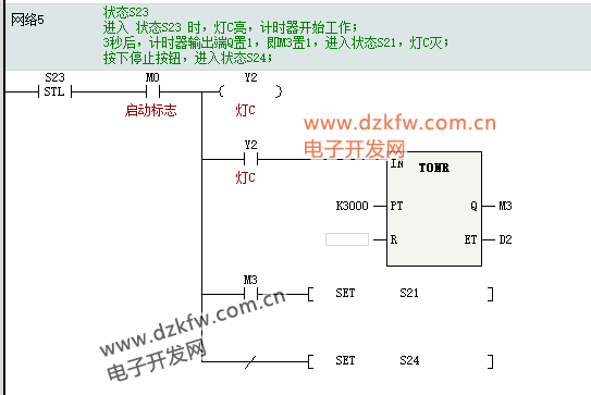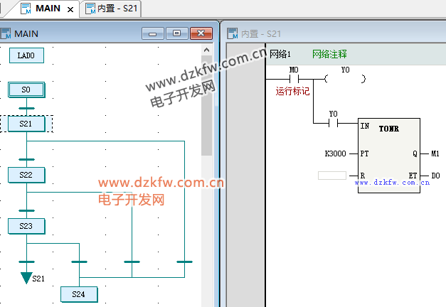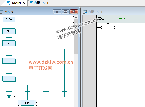 從上圖中可以看出,除了狀態(tài)轉移的指令被移除外,其他的都保留在狀態(tài)S21內置梯形圖中;