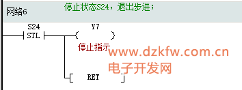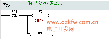 網(wǎng)絡6: 是狀態(tài)S24(停止狀態(tài));該狀態(tài)下“停止指示”燈亮,然后退出步進,回到主程序繼續(xù)執(zhí)行;