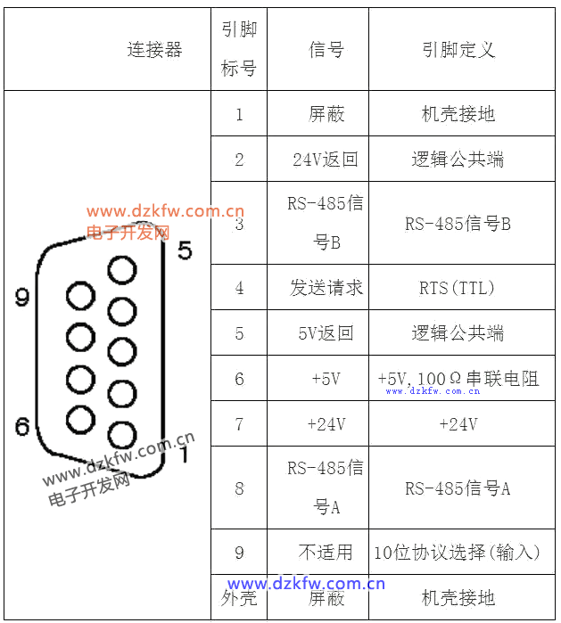 另外,關于EM DP01通信端口,其上的RS485串行通信接口為RS485兼容的九針迷你D型接口,符合歐洲標準EN 50170規定的PROFIBUS標準。引腳配置請參照相關圖示。