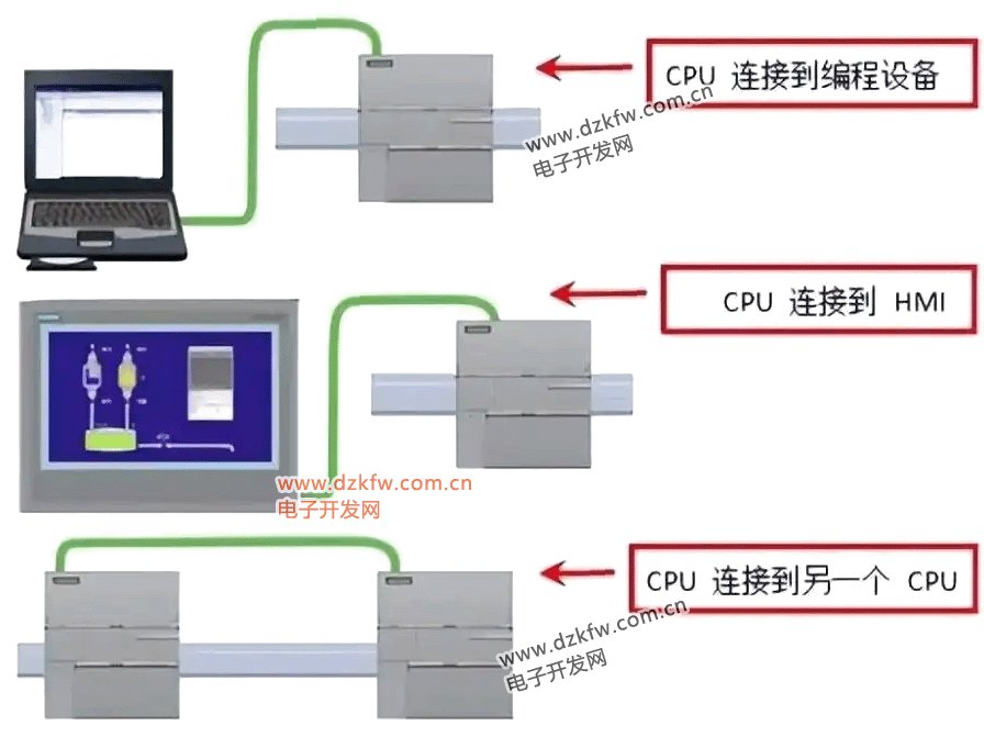 直接連接是指當CPU與編程設備、HMI或另一個S7-200 SMART CPU通信時,無需使用交換機,直接通過網線連接即可。