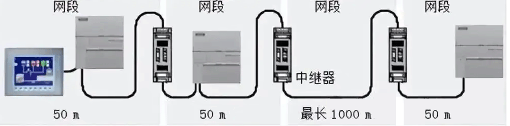 RS485中繼器不僅可以延長網絡距離,還可以實現不同網段間的電氣隔離,并增加網絡中的設備數量。但請注意,在S7-200 SMART CPU進行自由口通信、Modbus RTU通信和USS通信時,不建議使用西門子中繼器來擴展網絡。