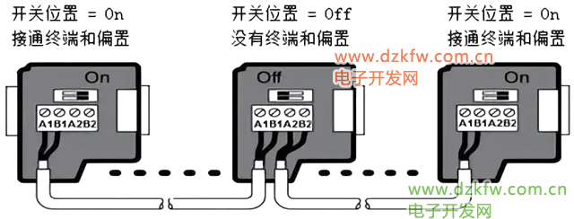 連接器上配備了兩組連接端子,分別用于接入輸入線纜和輸出線纜。此外,連接器還設有終端和偏置電阻的切換開關。位于網絡兩端的通信節點需將連接器上的開關置于開啟狀態(On),而網絡中間的通信節點則需將開關設置為關閉狀態(Off)。