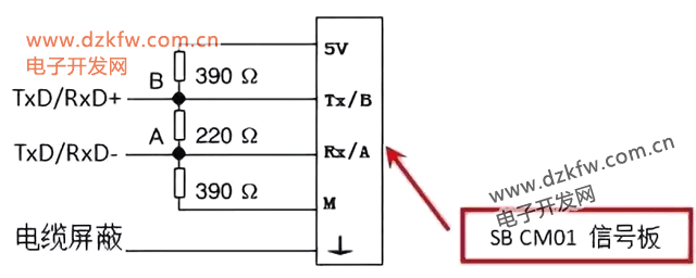 SB CM01信號板適用于RS485網絡的接入。當信號板作為終端通信節點時,需要接入終端電阻并連接偏置電阻。典型的電路配置如圖 7所示,詳細說明了SB CM01信號板在終端和偏置電阻方面的接線布局。