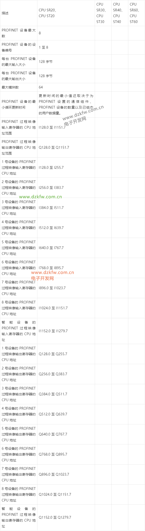 S7-200 SMART CPU 固件版本 V2.5 及更高版本支持基于以下八種 CPU 型號進行 PROFINET 通信。有關(guān)參數(shù)和 PROFINET 過程映像的詳細信息,請參見下表。