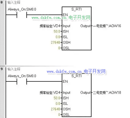 程序段 7 和 8 調用模擬量輸出庫指令,將預先設定好的目標頻率值通過模擬量通道輸出給變頻器。這一過程實現了從數據處理到實際控制的轉化,確保變頻器能夠按照程序設定的頻率運行,從而滿足系統的運行需求