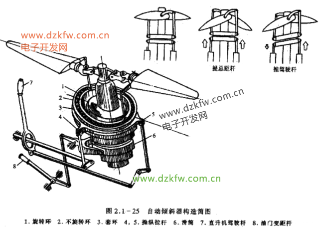 兩種飛機相同點都是由發動機帶動螺旋槳轉動產生升力源,不同點是直升機全靠發動機,機體接構的升力作用不大。而螺旋槳飛機則是螺旋槳,機翼配合作用。這也導致直升機的螺旋槳巨大,而螺旋槳飛機的槳葉卻很小。再一個不同,螺旋槳飛機的螺旋槳可以是定距的,不需要變距,而直升機的旋翼則必須要變距,這樣能夠使旋翼的作功效率提高,而且直升機的機動全憑旋翼的變化。直升機旋翼的調距是通過傾斜盤來實現的(見上圖),其旋翼用鉸鏈和傾斜盤鏈接,帶動旋翼沿旋翼軸線旋轉,旋轉的角度是預定好的,這樣直升機的旋翼就像劃水的槳一樣劃動空氣。直升機的旋翼只所以設計成這樣和旋翼的結構有關,直升機旋翼安裝在頂部,光向上向下飛不行,還要前后左右機動。而螺旋翼飛機輕型的兩片固定槳葉就能飛起來。