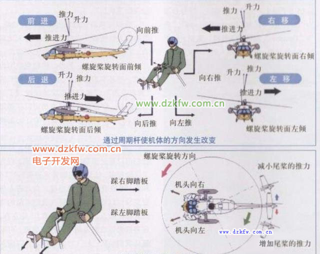 直升機的旋翼卻是有著眾多的功能。它不僅負責整架飛機的起降,還可通過槳轂的變距功能改變降距讓飛機進行前、后、左、右飛行,同時也可通過尾槳葉進行轉彎、消除主槳葉的旋轉力,防止直升機在空中產生旋轉,出現飛行故障。