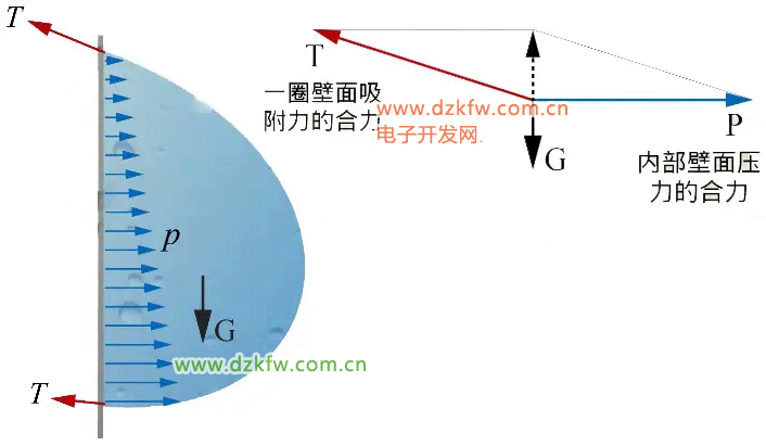 那么壁面上的水珠又是如何保持平衡?如果是固體,就是材料力學典型的懸臂結構,與重力平衡的是由壁面處的剪切力產(chǎn)生的。但靜止流體不存在剪切力,與重力平衡的是水珠表面一圈與固體接觸處的吸附力提供了向上的分力。而墻壁對水珠的支撐力則提供了向右的分力。力的平衡關系如下圖所示。表面張力的作用是在水珠表面形成薄膜,包裹內(nèi)部的水,水珠內(nèi)部只有壓力作用。
