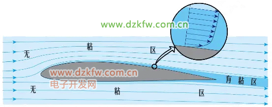 粘性的作用只有發(fā)生連續(xù)剪切變形才需要考慮粘性剪切力。變形又可以分為:平動、轉(zhuǎn)動、膨脹、剪切變形。前兩種是剛體作用不會產(chǎn)生內(nèi)應力,第三種體積均勻改變,流體內(nèi)部只是正壓力發(fā)生變化,只有第四種剪切變形會產(chǎn)生剪切力。 空氣在機翼附近處運動,由于氣體與固體表面存在吸附力,表面那一層氣體分子被粘在機翼上,離開機翼較遠處,氣流則保持較高速度。因此會存在這樣一層,其內(nèi)部氣流有較大的橫向速度梯度,如圓圈所示,這部分粘性力比較大,稱為有粘區(qū)。而較遠處速度梯度很小,粘性力可以忽略不計,這些區(qū)域稱為無粘區(qū)。