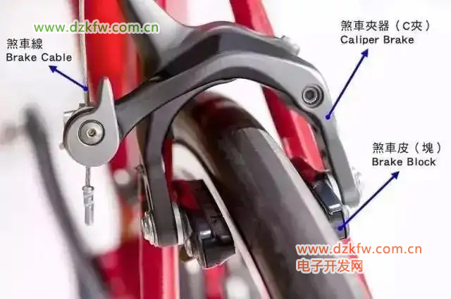 剎車夾器Caliper Brake-利用活動(dòng)件連結(jié)剎車塊,使車輪減速或停止。公路車常用的是C型剎車夾器(簡(jiǎn)稱C夾),亦有使用碟剎(Disc)。