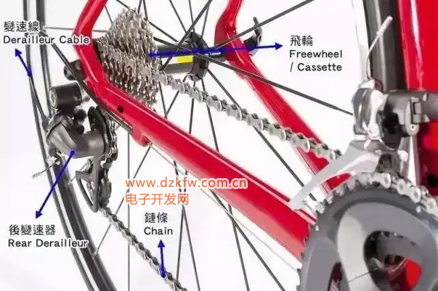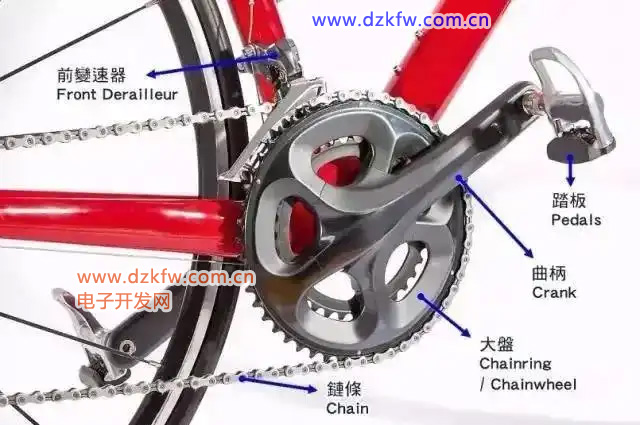 組成部分:踏板,曲柄,大盤,五通/中軸(簡(jiǎn)稱BB),鏈條,飛輪 ,前變速器,后變速器 ,變速線