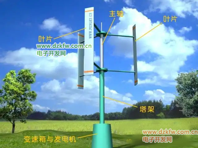 ②垂直軸風力發電機,風輪的旋轉軸垂直于地面或者氣流方向。