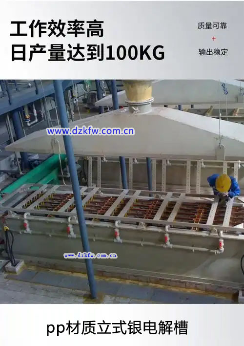 ③銀電解槽。目前國(guó)內(nèi)多用立式電極電解槽。它用硬質(zhì)聚氯乙烯焊成,槽內(nèi)用未接槽底的隔板橫向隔成若干小槽,小槽底部連通,電解液可循環(huán)流動(dòng)。槽底連通處設(shè)有滌綸布制成的帶式運(yùn)輸機(jī),專供運(yùn)出槽內(nèi)銀粉,槽面設(shè)有帶玻璃棒的機(jī)械攪動(dòng)裝置,可定期開(kāi)動(dòng),防止陰陽(yáng)極短路,又可攪動(dòng)電解液。