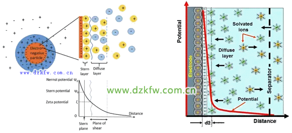 (1)帶電粒子在兩相之間出現(xiàn)了自發(fā)性的轉移,使得兩相中出現(xiàn)了等量相反的剩余電荷,形成所謂的“雙電層”;