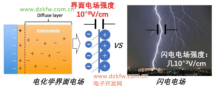 電荷在電極/電解液界面上發(fā)生轉移,形成雙電層,以及由此產(chǎn)生的界面電場。雖然雙電層電容兩側的電壓在宏觀上并不高,例如1V左右;但是雙電層的間距是微觀尺度的,因此根據(jù)電容的公式,可以推算出,界面電場中的電場強度可以達到10^8V/cm。