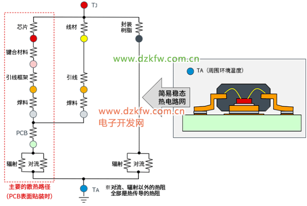 上圖右上方的IC截面圖中,每個部分的顏色與電路網圓圈的顏色相匹配(例如芯片為紅色)。芯片溫度TJ通過電路網中所示的熱阻達到環境溫度TA。